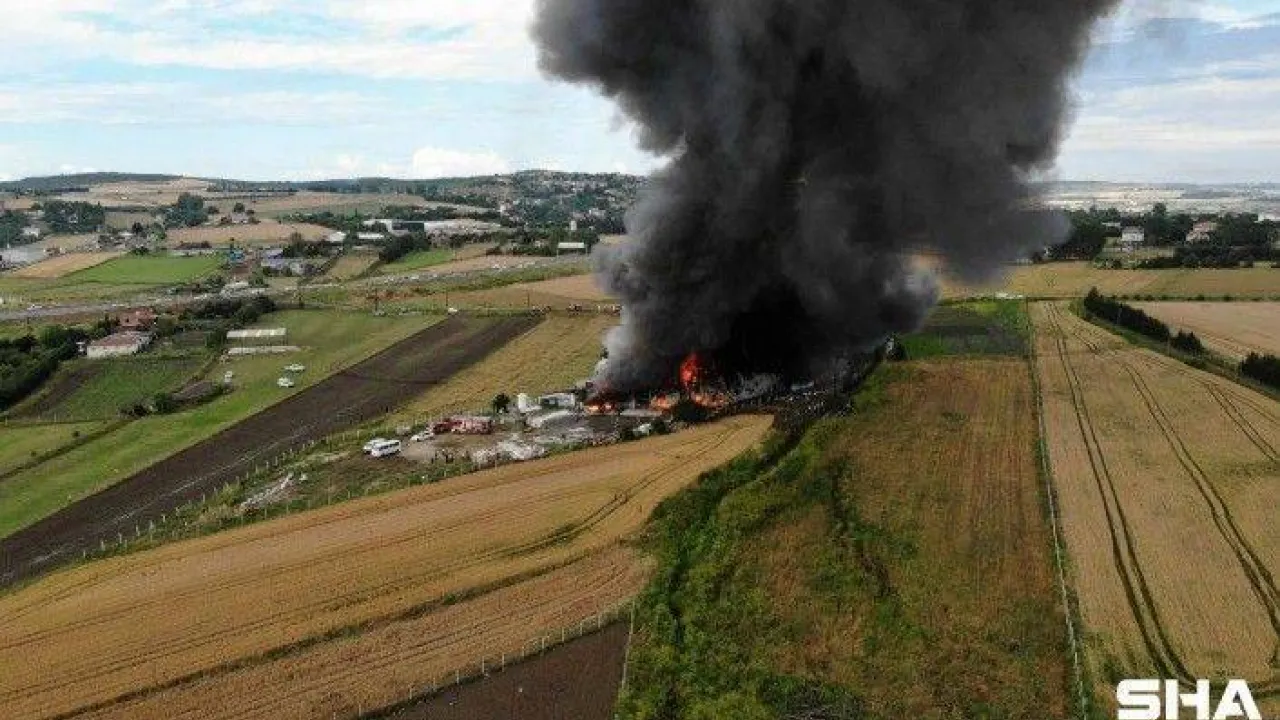 Çatalca'da bin 600 metrekarelik bir oyuncak fabrikasında yıldırımın düşmesinin ardından yangın çıktı. Olay yerine sevk edilen çok sayıda itfaiye ekibi yangına müdahale ediyor. Alev alev yanan fabrika drone ile havadan görüntülendi.