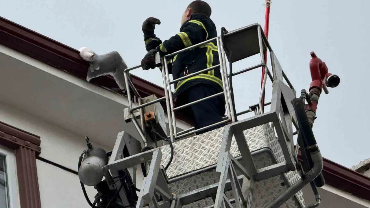 Edirne’de apartmanın çatısında sıkışan martı, itfaiye ekiplerince kurtarıldı.