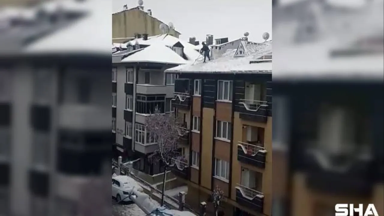 İstanbul'da etkili olan kar yağışı sonrası çatıya çıkan bir kişi, hiçbir güvenlik önlemi almadan kar temizlik çalışması yaptı. O anlar cep telefonu kamerası tarafından kaydedildi.