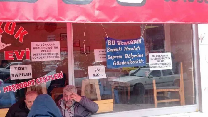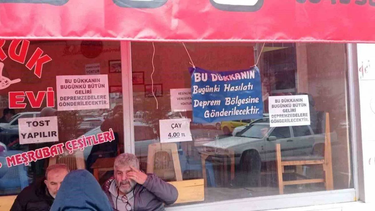 Kahramanmaraş ve çevresinde yaşanan depremler sonrasında Şükrü Doru k’un işlettiği bir çayevi bir günlük hasılatını deprem bölgesine bağışlama kararı aldı. Çayevine astığı yazı asan işyeri sahibi, müşterilerinden de tam not aldı. Gün boyu elde edilen 2 bin 560 lirayı Valiliğin hesap numaralarına aktaracağını anlatan işyeri sahibi, "Hepimiz üzüntülüyüz. Deprem bölgesine bir nebze de olsun katkımız olsun istedik. Bir günlük hasılatı bağışlama kararı aldık. İşyerimize böyle bir yazı astık. Müşterilerimiz de ilgi gösterdiler. Kazandığımız 2 bin 560 lirayı Zonguldak Valiliğinin belirttiği hesaba aktaracağız" ifadelerine yer verdi.