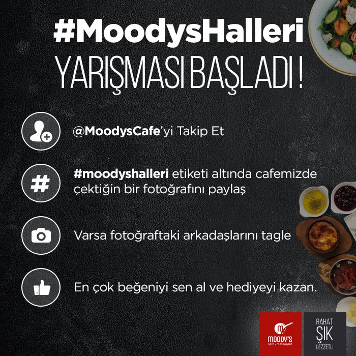 Silivri'nin en modern ve en leziz kafelerinden olan Moody'sCafe, sosyal medya üzerinden #Moodyshalleri etiketi altında yapılacak paylaşımlarla kendini ve modunu en iyi anlatacak ziyaretçilerini arıyor.