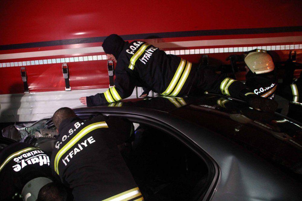 Tekirdağ Büyükşehir Belediyesi İtfaiye ekipleri ile Çerkezköy Organize Sanayi Bölge Müdürlüğü İtfaiye ekipleri TIR’ın altında sıkışan otomobildeki yaralıları kurtarmak için seferber oldu.