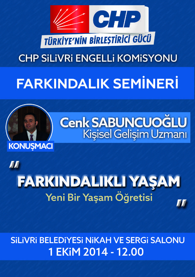 ‘Farkındalıklı Yaşam’ başlığı altında gerçekleştirilecek seminerde “Yeni Bir Yaşam Öğretisi” konulu seminer gerçekleştirecek olan Kişisel Gelişim Uzmanı Cenk SABUNCUOĞLU’nun konuk konuşmacı olarak katılacağı seminer 1 Ekim Çarşamba Günü saat 12:00’de Silivri Belediyesi Nikah ve Sergi Salonu’nda gerçekleşecek.