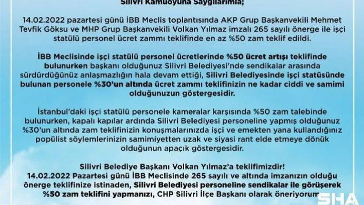 14.02.2022 Pazartesi günü İBB Meclisinde 265 sayılı ve altında imzanızın olduğu önerge teklifinize istinaden, Silivri Belediyesi personeline sendikalar ile görüşerek %50 zam teklifini yapmanızı, CHP Silivri İlçe Başkanı olarak öneriyorum."