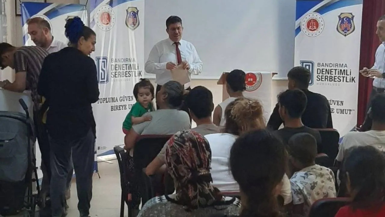 Bandırma Cumhuriyet Başsavcılığı Koruma Kurulu’nun Haziran ayı toplantısında alınan karar doğrultusunda, Kurban Bayramı’nda denetimli serbestlik tedbiri bulunan Çocuk Hizmetleri Bürosunda denetim ve iyileştirme takibi yapılan ihtiyaç sahibi suça sürüklenen çocukların giydirilmesine yönelik Bandırma Ticaret Odası tarafından karşılanan bir giyim firmasında kullanılmak üzere 750 Türk lirası değerindeki 30 adet alışveriş kartının dağıtımı, Bandırma Denetimli Serbestlik Müdürlüğü Toplantı Salonunda yapılan bir etkinlikle gerçekleşti. Yapılan etkinlikte Kurban Bayramı vesilesiyle suça sürüklenen çocuklar ve aileleriyle bayramlaşma yapılıp Kurum Müdürü Özcan Deniz tarafından hediye kartları takdim edildi.