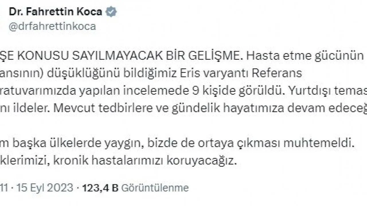 Sağlık Bakanı Fahrettin Koca, sosyal medya hesabından yaptığı paylaşımda, “Hasta etme gücünün (virülansının) düşüklüğünü bildiğimiz Eris varyantı referans laboratuvarımızda yapılan incelemede 9 kişide görüldü. Yurt dışı temaslı ve aynı ildeler. Mevcut tedbirlere ve gündelik hayatımıza devam edeceğiz. Durum başka ülkelerde yaygın, bizde de ortaya çıkması muhtemeldi. Büyüklerimizi, kronik hastalarımızı koruyacağız” ifadelerine yer verdi.