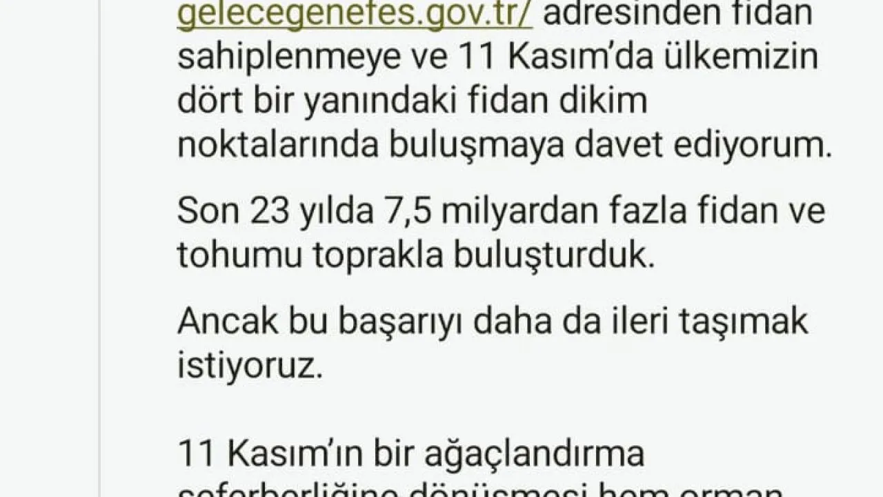 "Ancak bu başarıyı daha da ileri taşımak istiyoruz. 11 Kasım’ın bir ağaçlandırma seferberliğine dönüşmesi hem orman yangınlarının açtığı yaraların sarılması hem de çocuklarımıza bırakacağımız zümrüt yeşili bir miras için önemli bir fırsattır. Fidan sahiplenerek 11 Kasım’da toprakla buluşturacak kıymetli vatandaşlarımıza şimdiden teşekkür ediyorum."