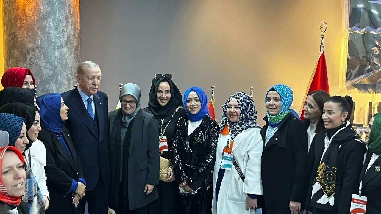 önünde AK Parti İl Kadın Kolları Başkanlığı üyeleri ile bir araya gelen Erdoğan, onlarla birlikte fotoğraf çektirdi.
