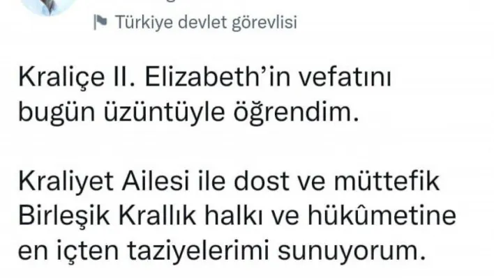 Cumhurbaşkanı Erdoğan, hayatını kaybeden İngiltere Kraliçesi 2. Elizabeth için sosyal medya hesabı üzerinden bir taziye mesajı yayımladı.