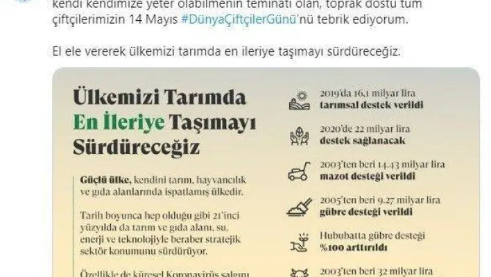 Cumhurbaşkanı Recep Tayyip Erdoğan, resmi sosyal medya hesabı üzerinden "Dünya Çiftçiler Günü" dolayısıyla bir paylaşımda bulundu. Tüm çiftçilerin ’Dünya Çiftçiler Günü’nü tebrik eden Cumhurbaşkanı Erdoğan, "Her zaman yanında olduğumuz, her koşulda desteklediğimiz, üretimimizin, kendi kendimize yeter olabilmenin teminatı olan, toprak dostu tüm çiftçilerimizin 14 Mayıs #DünyaÇiftçilerGünü’nü tebrik ediyorum. El ele vererek ülkemizi tarımda en ileriye taşımayı sürdüreceğiz" ifadelerini kullandı.