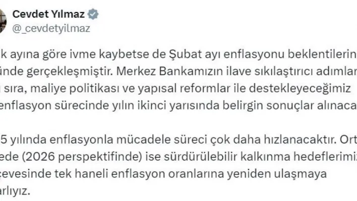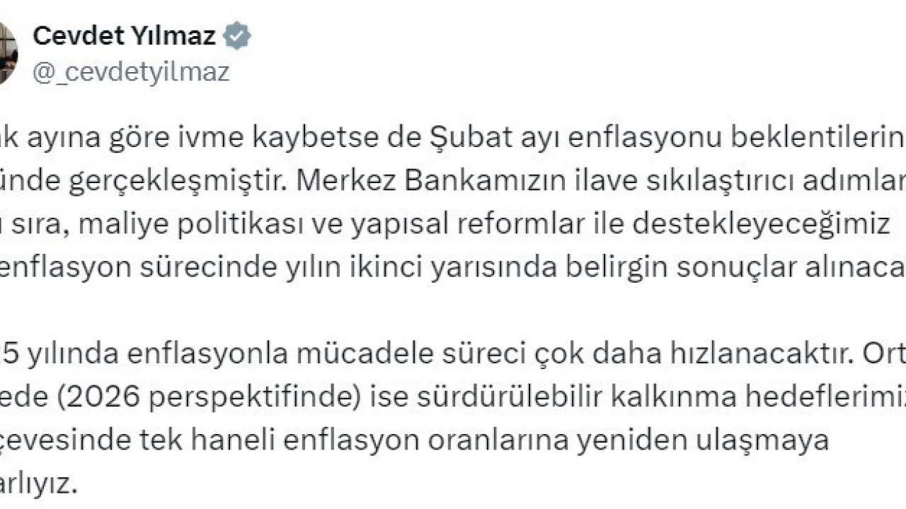 Cumhurbaşkanı Yardımcısı Cevdet Yılmaz, Hazine ve Maliye Bakanı Mehmet Şimşek’in paylaşımını alıntılayarak yaptığı paylaşımda, “Ocak ayına göre ivme kaybetse de şubat ayı enflasyonu beklentilerin üstünde gerçekleşmiştir. Merkez Bankamızın ilave sıkılaştırıcı adımlarının yanı sıra, maliye politikası ve yapısal reformlar ile destekleyeceğimiz dezenflasyon sürecinde yılın ikinci yarısında belirgin sonuçlar alınacaktır. 2025 yılında enflasyonla mücadele süreci çok daha hızlanacaktır. Orta vadede (2026 perspektifinde) ise sürdürülebilir kalkınma hedeflerimiz çerçevesinde tek haneli enflasyon oranlarına yeniden ulaşmaya kararlıyız” ifadelerini kullandı.