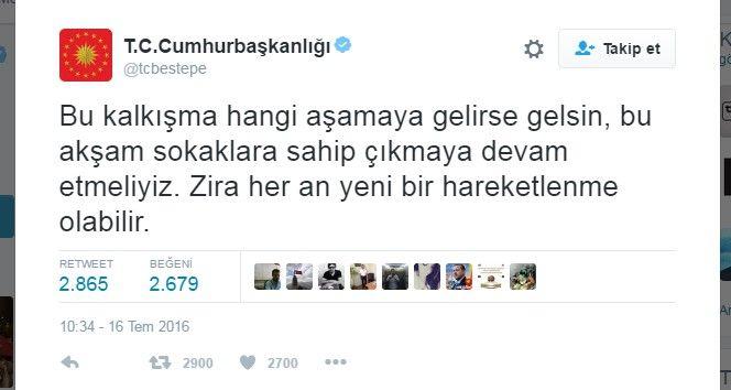 Cumhurbaşkanlığı, darbe girişimi sonrası yaptığı açıklamada: 'Bu akşam sokaklara sahip çıkmaya devam etmeliyiz zira her an yeni bir hareketlenme olabilir' açıklaması yaptı.
