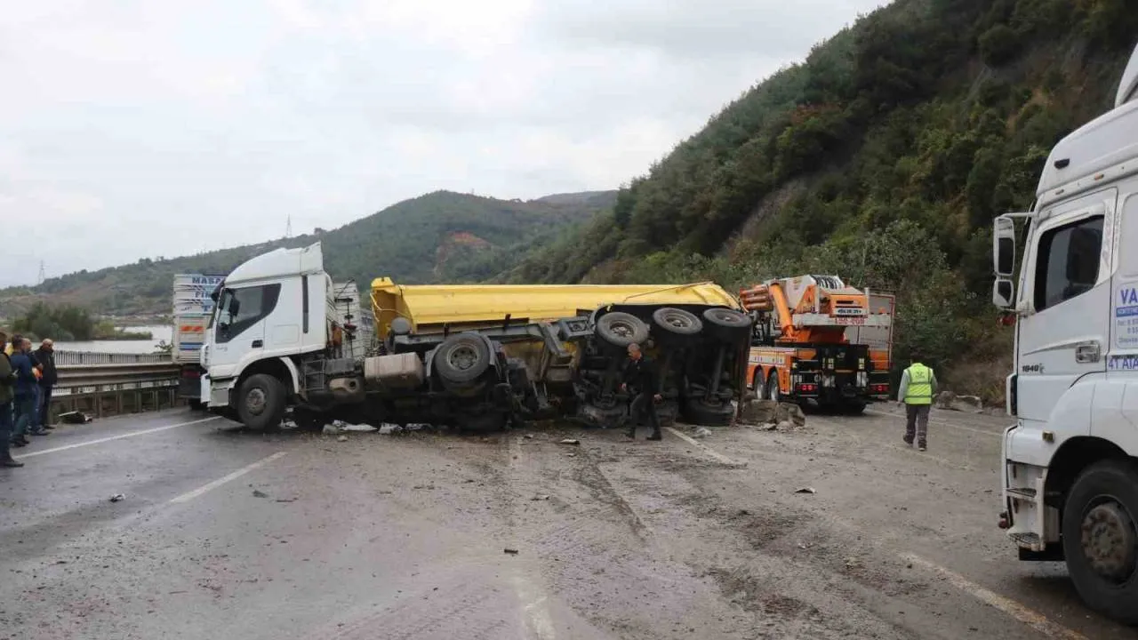 D-650 kara yolu Kızılkaya Mahallesi mevkiinde meydana gelen kazada, Bilecik istikametine seyir halinde olan Bilecik Belediyesi’ne ait çöp kamyonu yapış sebebiyle kontrolden çıkarak devrildi. Kazayı gören 34 GBV 001 plakalı hafriyat tırı ani fren yapması neticesinde kontrolden çıkarak karşı şeride geçip yan yattı. Aynı istikamette seyir halinde olan ve kazayı gören 03 HS 078 plakalı kamyon ise manevra yaparak karşı yönden gelen 55 AFB 136 plakalı tır ile kafa kafaya çarpıştı. Meydana gelen zincirleme trafik kazasında Bilecik Belediyesi’ne ait çöp kamyonundaki sürücü yaralandı. Durumum haber verilmesi üzerine bölgeye sağlık, jandarma, polis ve itfaiye ekibi sevk edildi. Olay yerine gelen sağlık ekipleri yaptıkları ilk müdahale sonrasında yaralıyı hastaneye sevk etti. Meydana gelen kaza neticesinde D-650 kara yolunun her iki istikameti trafiğe kapandı. Kaza sebebiyle kara yolunun her iki istikametinde de kilometrelerce araç kuyruğu oluştu. Ekipler, kazaya karışan araçları bulunduğu yerden kaldırmak için çalışmalarını sürdürürken kazaya ilişkin inceleme başlatıldı.