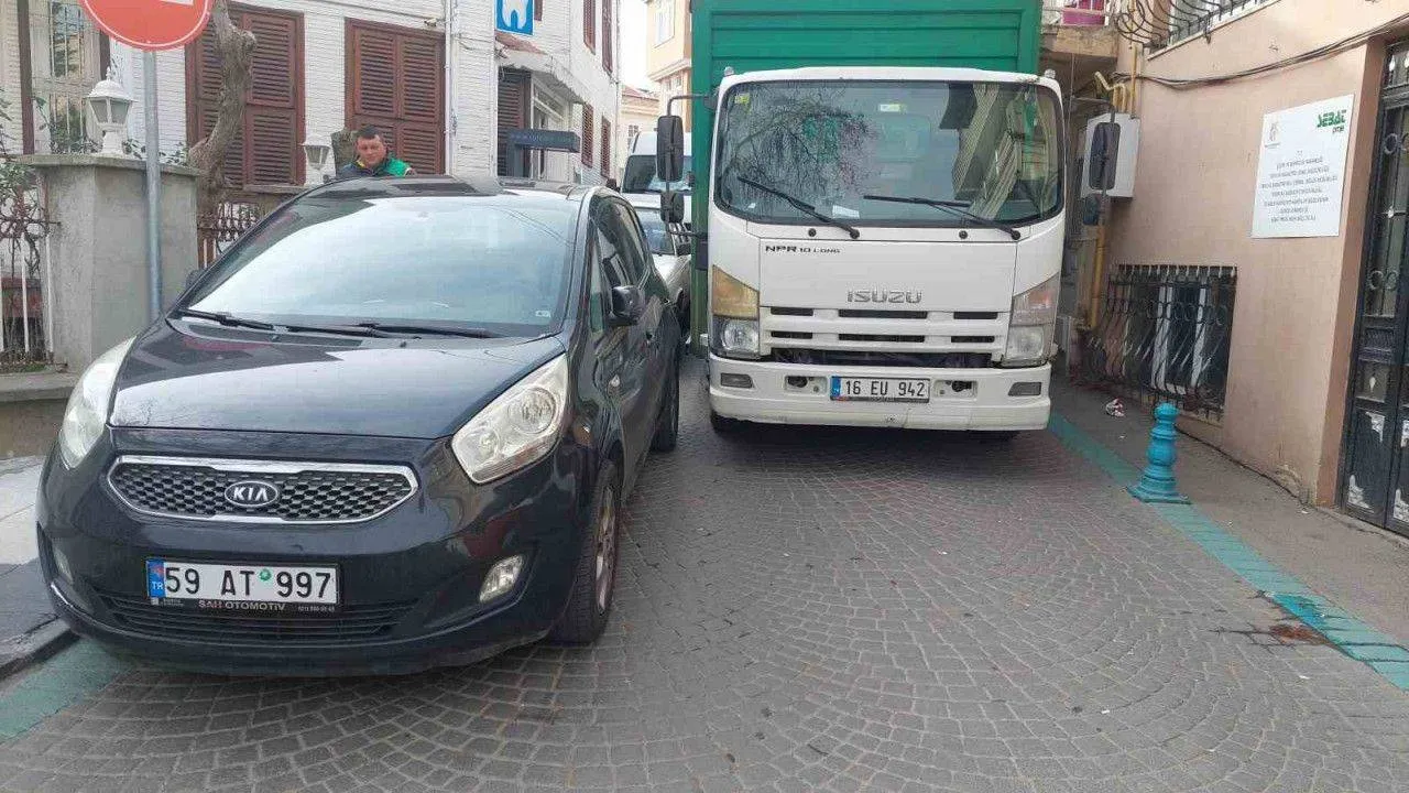 Tekirdağ’ın Süleymanpaşa ilçesinde dar sokakta uygunsuz vaziyette park yapılınca geçiş yapmaya çalışan kamyonet sıkıştı.