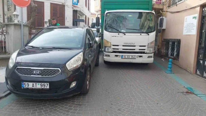 Tekirdağ'ın Süleymanpaşa ilçesinde dar sokakta uygunsuz vaziyette park yapılınca geçiş yapmaya çalışan kamyonet sıkıştı.