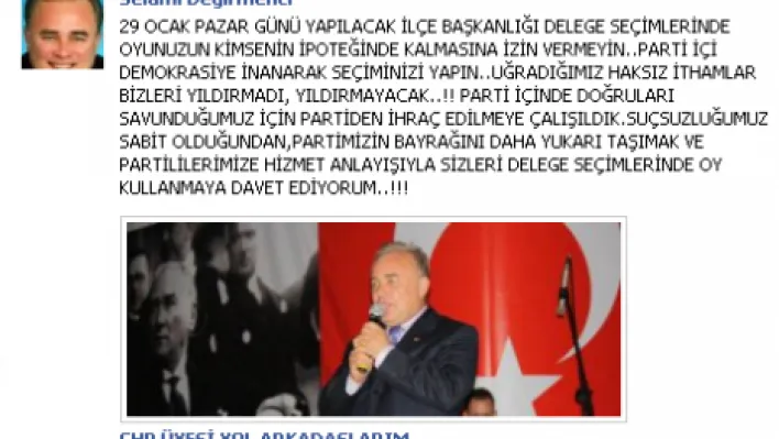 “29 Ocak Pazar Günü Yapılacak İlçe Başkanlığı Delege Seçimlerinde Oyunuzun Kimsenin İpoteğinde Kalmasına İzin Vermeyin..Parti İçi Demokrasiye İnanarak Seçiminizi Yapın..Uğradığımız Haksız İthamlar Bizleri Yıldırmadı, Yıldırmayacak..!! Parti İçinde Doğruları Savunduğumuz İçin Partiden İhraç Edilmeye Çalışıldık.Suçsuzluğumuz Sabit Olduğundan,Partimizin Bayrağını Daha Yukarı Taşımak Ve Partililerimize Hizmet Anlayışıyla Sizleri Delege Seçimlerinde Oy Kullanmaya Davet Ediyorum.