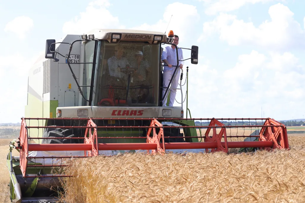İBB Başkanı Ekrem İmamoğlu ve Silivri Belediye Başkanı Bora Balcıoğlu, İstanbul'un iklim ve toprak şartlarına uyumlu yerli buğdayların deneme hasadını, Silivrili çiftçi Ercan Tarladaçalışır ile birlikte yaptı.