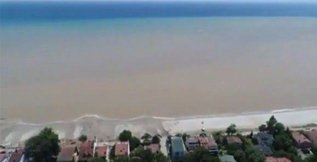 Şiddetli yağışın etkisi ile meydana gelen su baskınları sonrası Silivri'de denize karışan sel suları denizin rengini çamura buladı.