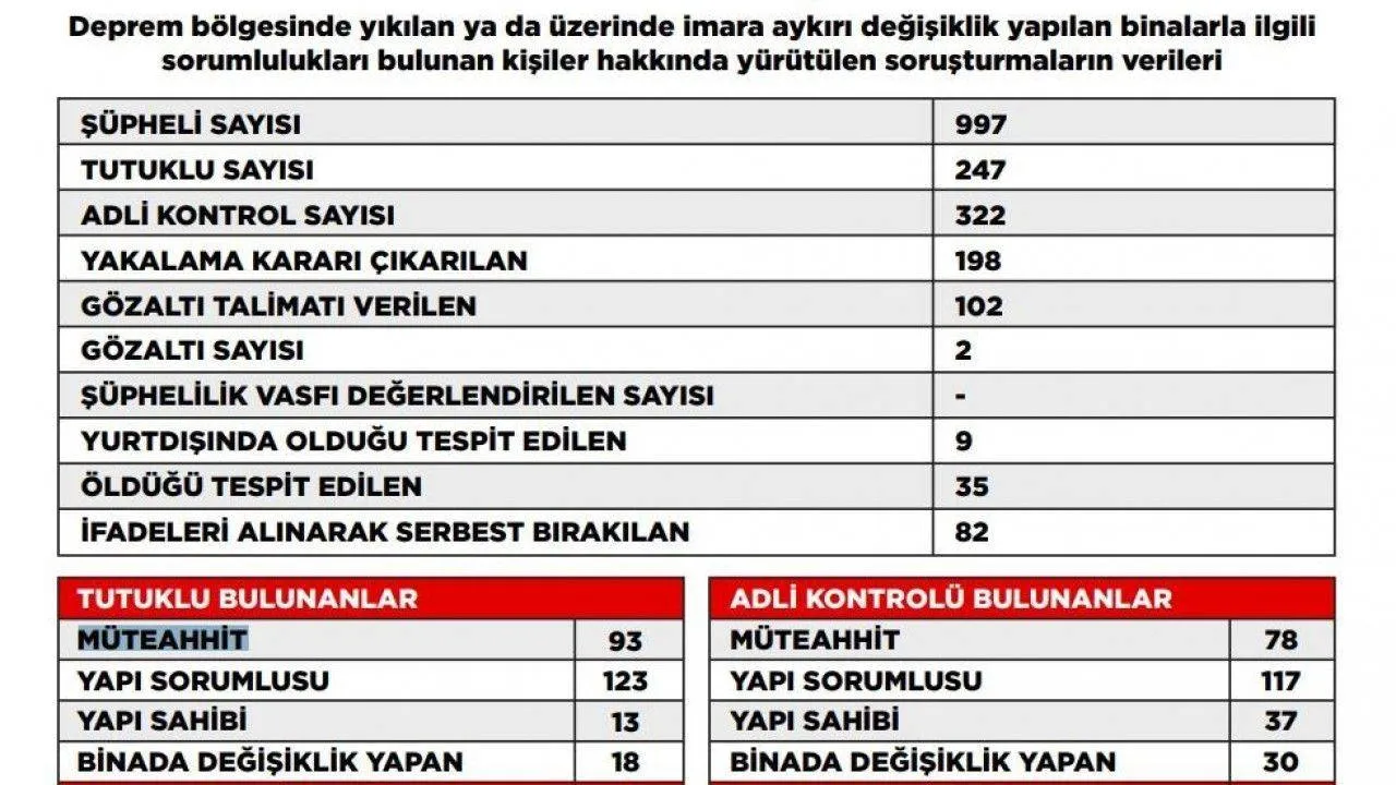 Kahramanmaraş merkezli yaşanan depremlerin ardından soruşturmalar devam ediyor. Yaşanan felaketin ardından 93 müteahhit, 123 yapı sorumlusu, 13 yapı sahibi, 18 yapıda değişiklik yapan şahıs tutuklandı.