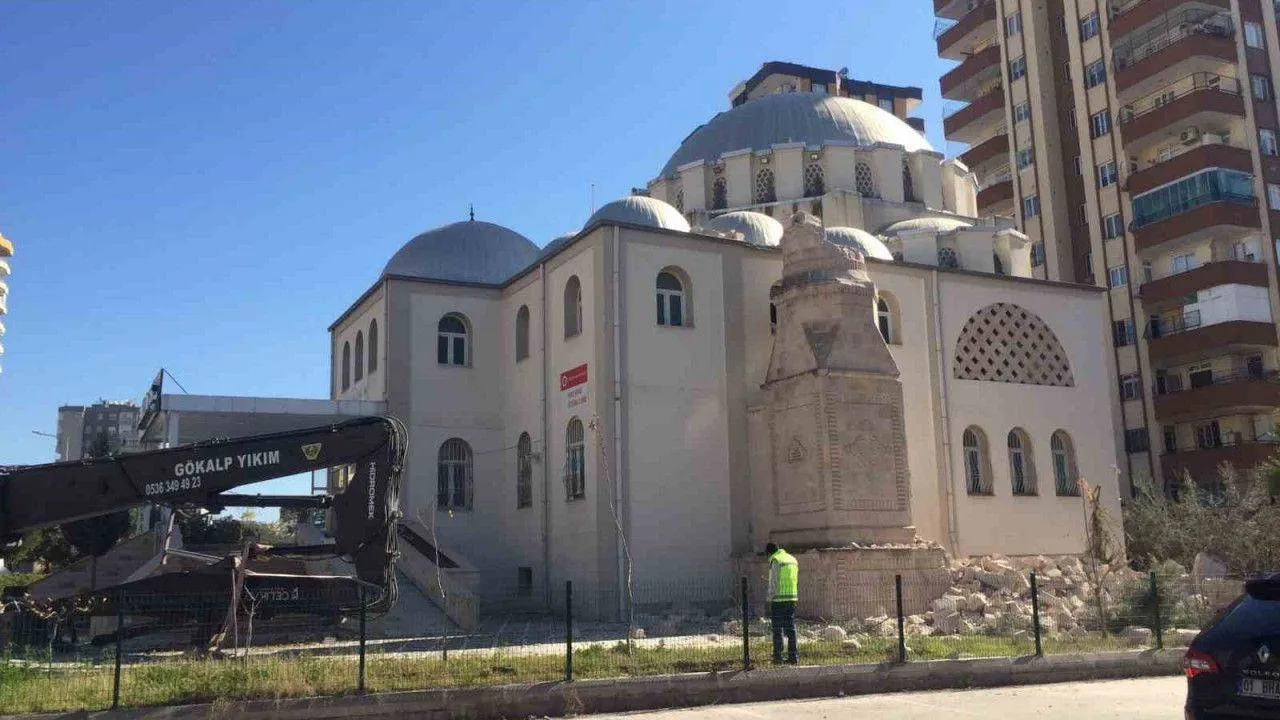 Adana’da meydana gelen depremde hasar gören Hacı Şevki Özgür Camii’nin minaresi iş makinasıyla kontrollü şekilde yıkıldı.