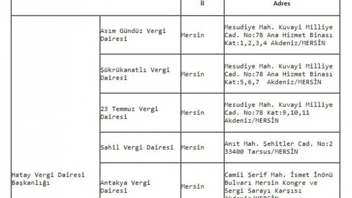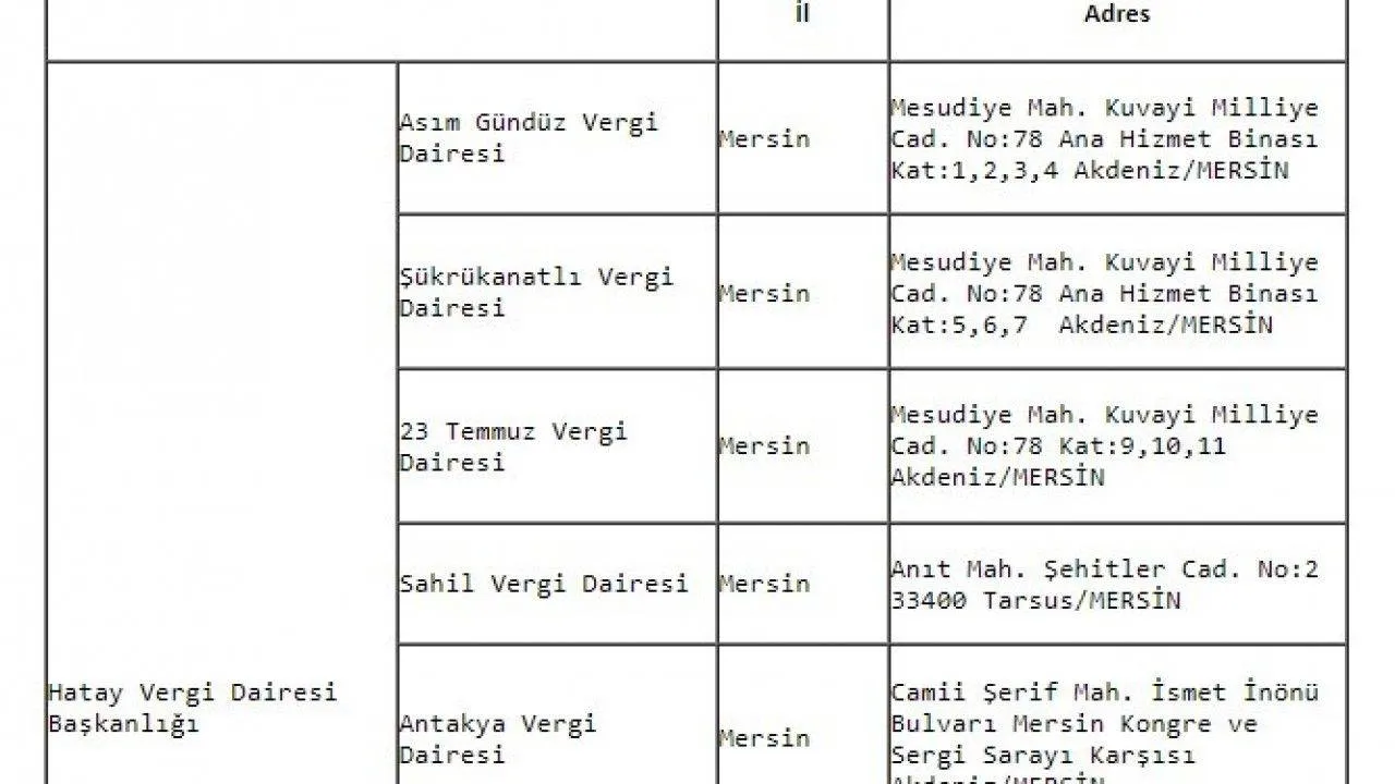 Buna göre, Hatay Vergi Dairesi Başkanlığına bağlı Asım Gündüz, Şükrü Kanatlı, 23 Temmuz, Sahil, Antakya, Kırıkhan, Reyhanlı, Samandağ ve Akdeniz vergi daireleri Mersin’de, Kahramanmaraş Vergi Dairesi Başkanlığına bağlı Aslanbey, Elbistan, Afşin, Pazarcık, Aksu vergi daireleri Kayseri’de, Adıyaman Defterdarlığı Sivas’ta, Gaziantep Vergi Dairesi Başkanlığına bağlı İslahiye Vergi Dairesi Şehitkamil ilçesinde, Şanlıurfa Vergi Dairesi Başkanlığına bağlı Şehitlik, Topçu Meydanı, Göbeklitepe, Birecik vergi daireleri Siverek, Viranşehir ve Suruç’ta, Malatya Vergi Dairesi Başkanlığına bağlı Fırat ve Beydağı vergi daireleri Kayseri’de, Osmaniye Defterdarlığına bağlı Kadirli Vergi Dairesi de Osmaniye’de Adnan Menderes Mahallesi’nde hizmet verecek.