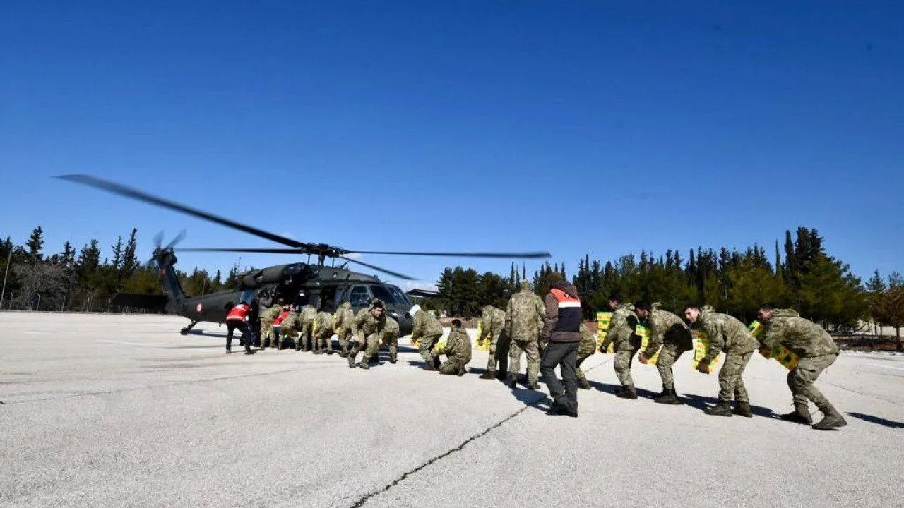 Kahramanmaraş merkezli 7.7 ve 7.6 büyüklüğündeki depremlerden etkilenen Gaziantep'in Nurdağı ve İslahiye ilçelerinin dağlık kesiminde bulunan köylere askeri helikopterlerle yardım malzemeleri ulaştırıldı.