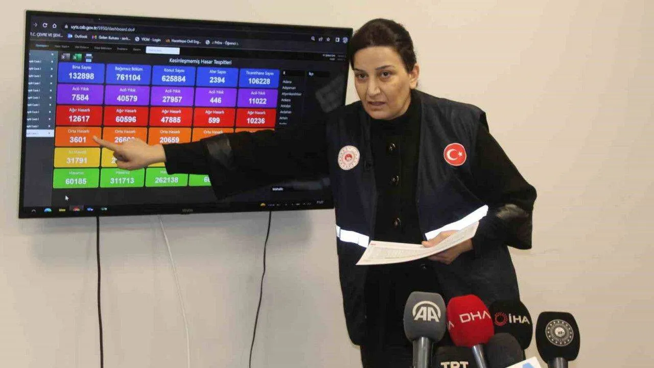 Çevre, Şehircilik ve İklim Değişikliği Bakanlığı Yapı İşleri Genel Müdürü Banu Aslan, Kahramanmaraş merkezli depremlerle ilgili 10 ilde başlayan ve yüzde 35’i tamamlanan hasar tespit çalışmalarında 7 bin 854 yıkık ya da acilen yıkılması gereken bina, 12 bin 617 binanın ağır hasarlı ve oturulamaz halde olduğunun belirlendiğini söyledi.