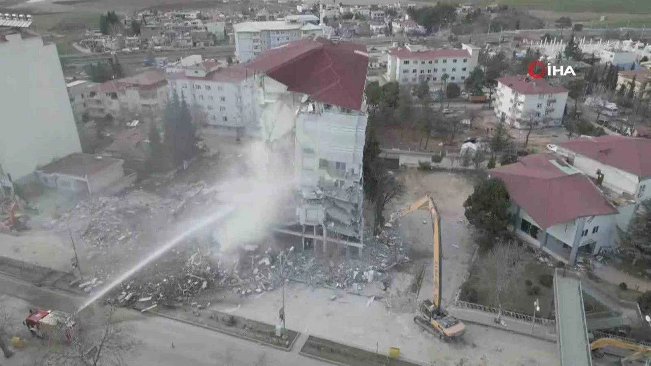 6 Şubat sabah saat 04.17’de 7,7 büyüklüğünde meydana gelen depremin merkez üssü Kahramanmaraş’ın Pazarcık ilçesinde deprem çalışmaları devam ediyor. Bu kapsamda, ilçede bulunan binaların artçı sarsıntılarda beklenmedik bir zamanda yıkılmaması için kontrollü yıkım çalışmaları başladı. Apartmanlar, yıkım sorumlusu gözetiminde, toz olmaması için enkaza su sıkan itfaiye ekipleri eşliğinde vinçlerle yıkılıyor. İlçenin girişinde bulunan 10 katlı bir apartmanın yıkımı havadan görüntülendi.