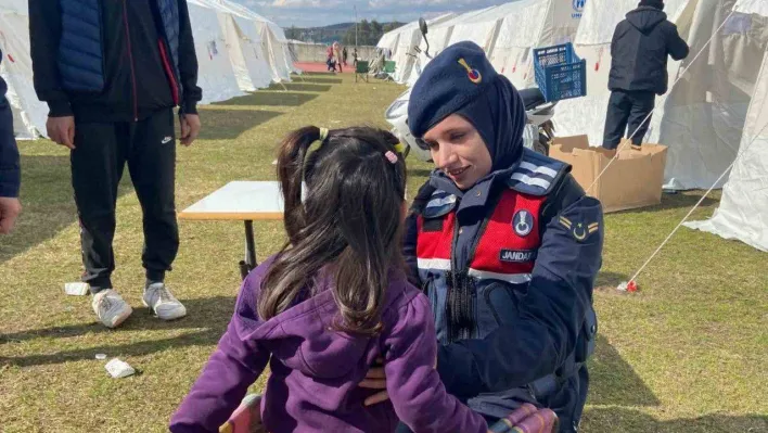Depremden etkilenen çocukların psikososyal yönden desteklenmesi amacıyla bölgede bulunan kadın astsubaylar ise çocukları dinliyor, onlara güven veriyor ve çocuklarla oyun oynuyor.