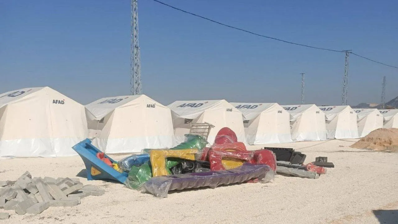 Hatay Defne'de kurulan çadır kentin güvenliğini sağlamak için çit yapımı sürdürülürken bir yandan da çocukların travma yaşamasının önüne geçmek amacıyla oyun parkı yapılıyor.