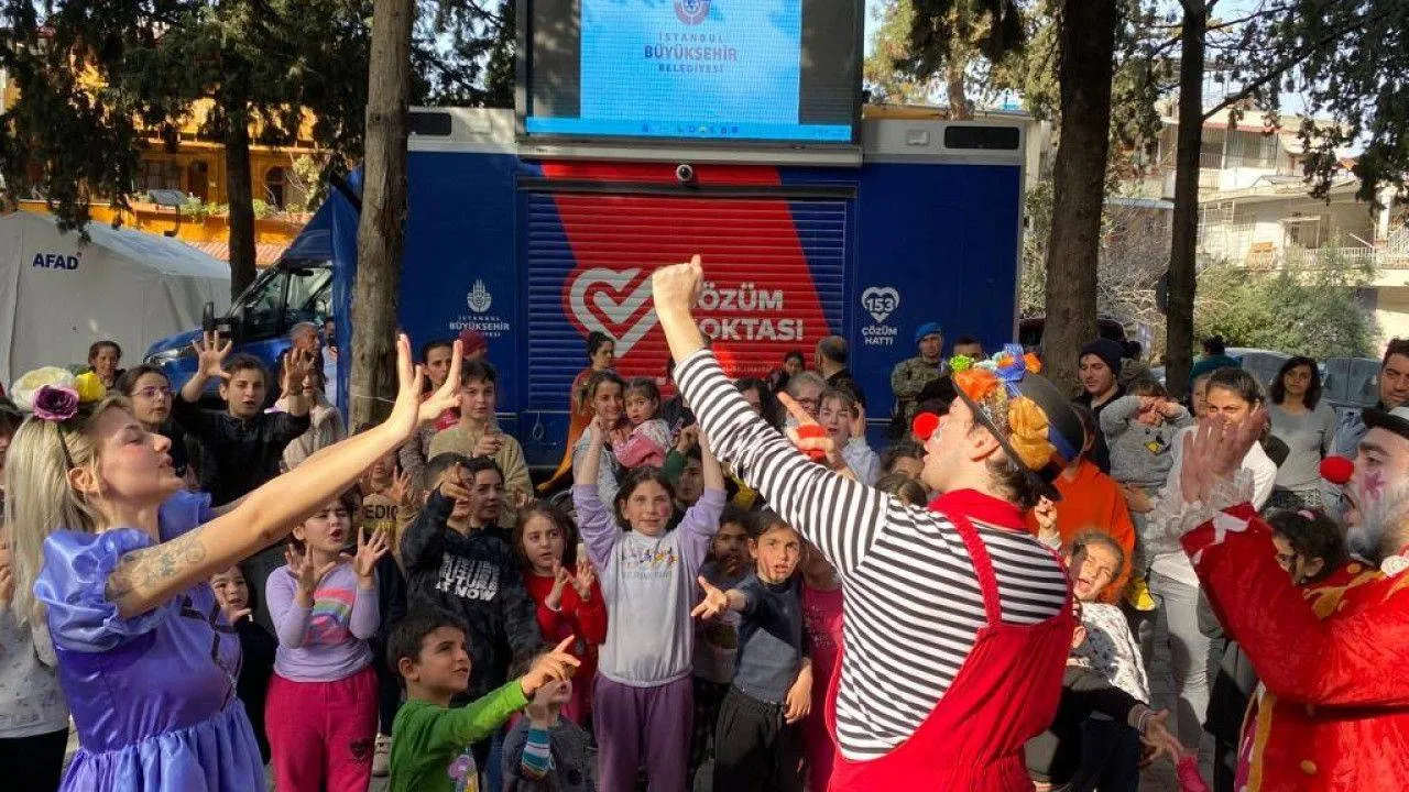 Hatay’ın Defne ilçesi Harbiye Mahallesi’ne giden gönüllü tiyatro oyuncuları, depremden olumsuz etkilenen çocuklara moral vermek ve süreci kolay atlatmalarını sağlamak adına eğlenceli etkinlikler düzenliyor. Bucan Ekin Şimşek, Cengizhan Özdilek ve Tuana Bayrak, çocukların yüzlerinde tebessüm oluşturuyor. Harbiye Mahallesi’ndeki depremzede çocuklar, palyaço ve pamuk prenses gösterileri, dansları ve oyun etkinlikleriyle doyasıya eğleniyor. Gönüllü tiyatrocular, sihirbazlık gösterisi, sosis balon yapımı, yüz boyama ve pamuk şeker dağıtımı gibi etkinliklerle de çocuklara keyifli vakitler yaşatıyor.