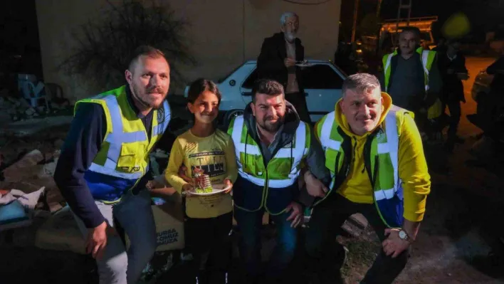 Hataylıların yaralarını sarmaya çalışan Bursa Büyükşehir Belediyesi, sadece erzak değil, aynı zamanda moral de dağıtıyor. Gündüz tanıştıkları 9 yaşındaki Zehra Karataş’ın doğum günü olduğunu öğrenen ekipler, gece ise erzak, su, giyecek ve yakacak yanında bir de yaş pasta ile çadırına geldikleri Zehra ve ailesine doğum günü sürprizi yaptı.