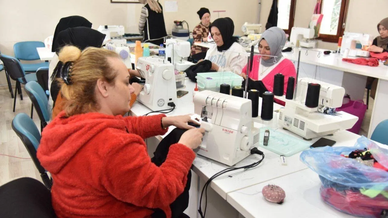 Kartepe'de meslek edindirme kurslarında eğitim alan kadınlar, depremzedelerin üşümemesi için kıyafet dikiyor.