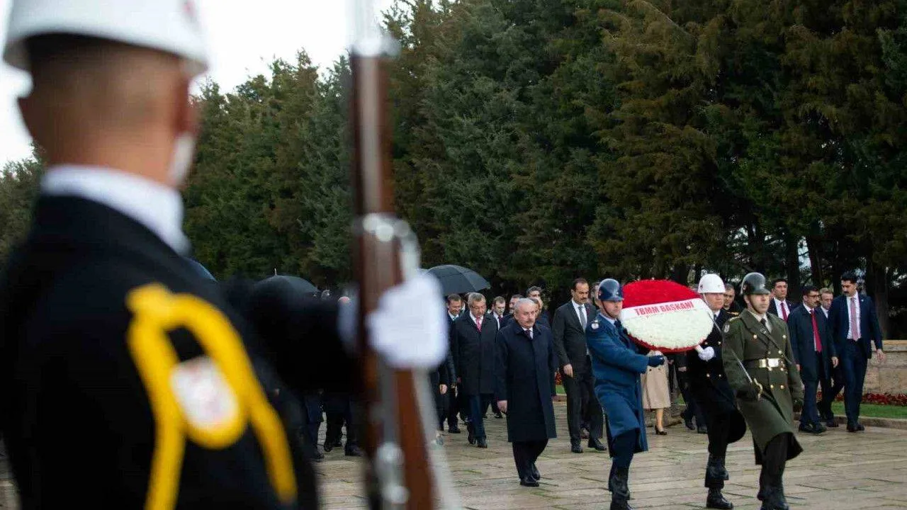Aslanlı Yol’dan yürüyerek Atatürk’ün mozolesine gelen heyet, mozoleye çelenk bırakılmasının ardından saygı duruşunda bulundu ve İstiklal Marşı okudu. Heyetle birlikte daha sonra Misak-ı Milli Kulesi’ne geçen TBMM Başkanı Şentop, Anıtkabir Özel Defteri’ni imzaladı.
