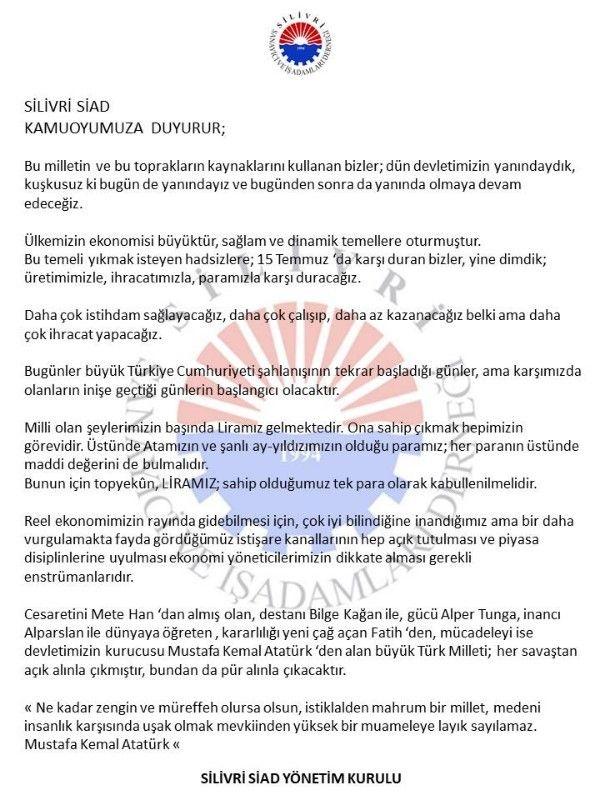 Silivri Sanayici ve İş adamları Derneği, 'Bizler dün devletimizin yanındaydık, kuşkusuz bugün de yanındayız ve bugünden sonra da yanında olmaya devam edeceğiz' şeklinde yazılı bir açıklama yaptı.