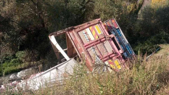 Direksiyonu kitlenen sebze yüklü kamyon şarampole uçtu