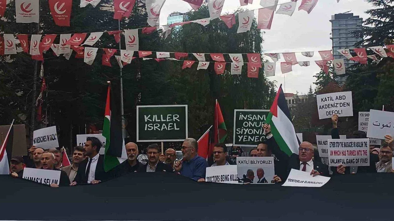 Dışişleri Bakanlığı önünde toplanan farklı sivil toplum kuruluşları, Ankara’da bulunan Amerika Birleşik Devletleri (ABD) Dışişleri Bakanı Antony Blinken ile Filistin’e askeri harekat düzenleyen İsrail’i protesto etti.