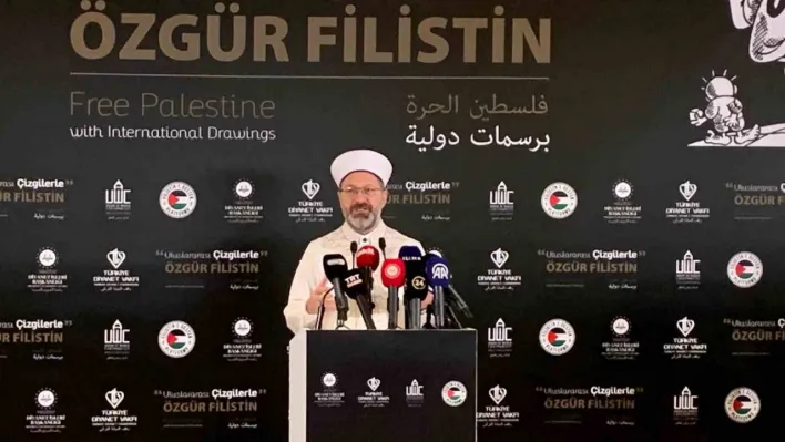 Diyanet İşleri Başkanı Ali Erbaş, “Uluslararası Çizgilerle Özgür Filistin” sergisinde yer alan eserlerde tarihin sanat alanındaki doğrulayıcısı olarak kabul edilebilir. Kudüs ve çevresi bugünlerde eşi görülmemiş bir katliama, vahşete maruz kalmaktadır. Bir asra yakın bir zamandır kanayan yaramız olan Filistin her geçen gün insanlığın vicdanını daha fazla parçalayan, kanatan acılara sahne olmaktadır. Bir millet Gazze’de Batı Şeria’da Kudüs’te ve Filistin’in diğer bütün şehir benzeri görülmemiş bir zulme maruz bırakılmakta. Bir millet topyekun yok edilmeye çalışılmakta, soykırıma uğratılmaktadır. Çoğunluğu çocuk ve kadın olan binlerce kardeşimiz İsrail saldırılarında hayatını kaybetti. İnsanların en temel ihtiyaçlarına ulaşmaları birçok şekilde engellendi. Hastaneler, okullar, ibadethaneler yerle bir edildi. Hala devam eden yoğun bombardımanda yaralanarak hastanelere sığınan yüzlerce insanın hastanelerin bombalanmasıyla hayatta kalma umutları da ellerinden alındı. Yeni doğmuş bebekler, küvözlerde can verdi. Bu elim olaylar yaşanırken İslam ülkeleri bir araya gelerek ortak bir tavırla yeterince tepki veremedi. İslam’a karşı her türlü eyleme hoşgörü ve özgürlükle bakan Batılı ülkeler ise yıllardır sistemli bir şekilde soykırıma maruz bırakılan Filistinlilerin asil direnişlerini, haklı özgürlük davalarını terörizm olarak gördü. Ancak İsrail’in Filistin halkına ait toprakları sistemli bir şekilde işgal ve Gazze’de uyguladığı soykırım tarihe kara bir leke olarak ve en büyük terör faaliyeti olarak geçti. Bunu tarih kaydetti. Burada sergilenen eserler pek tabii sadece bir etkinlikte yer almaları için üretilmediler. Sanatçılar Filistin’de yaşanan katliama ve katliam karşısında dünyanın umursamazlığına tepkilerini, çizgileriyle ifade ettiler. Bir insanlığın tükenişine duyulan acıyı dile getiren sergideki eserler doğrudan hayatın kendisine yaşanılan drama odaklanarak zalim bir devletin vahşetine tanıklık etmektedir. Bu eserler, bu sergi insanlık adına değerli olan ne varsa çiğneyip kötülükleri savunan bir ahlaki kirlenmişliği, bir insani yoksunluğu sanatsal öğelerle ortaya koymaktadır" ifadelerini kullandı.