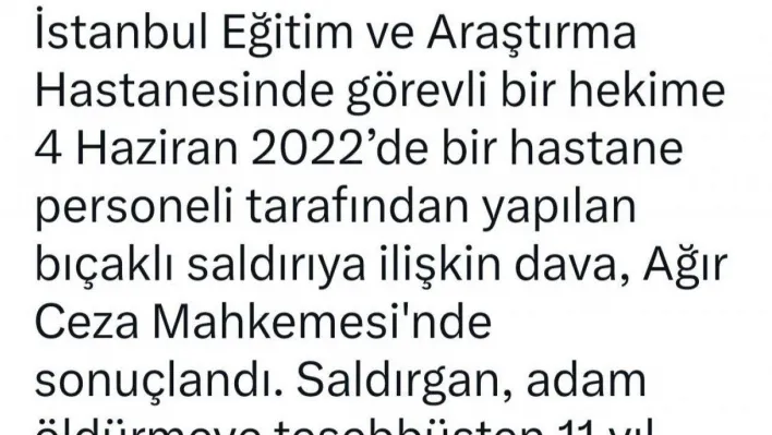 İstanbul Eğitim ve Araştırma Hastanesinde pratisyen hekim Halit Altınok'a bıçakla saldıran temizlik görevlisine mahkeme tarafından 11 yıl hapis cezası verildi. Sağlık Bakanı Fahrettin Koca, verilen ceza sonrası sosyal medya hesabından teşekkür paylaşımı yaptı.