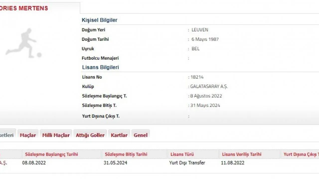 Galatasaray, mayıs sonunda sözleşmesi sona erecek olan Dries Mertens ile 1 yıl daha anlaştığını Türkiye Futbol Federasyonu’na (TFF) bildirdi. Sarı-kırmızılılar, Belçikalı futbolcunun gösterdiği başarılı performansla, sezon başında 1+1 yıllık sözleşme opsiyonunu kullanarak 2024 Haziran ayına kadar uzattı. 36 yaşındaki orta saha, bu sezon 31 resmi maçta 7 gol atarken, 4 asistlik performans sergiledi.