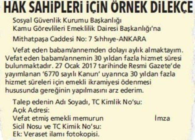 Farklar hesaplanırken memurların görevlerinden ayrıldıkları tarihteki emekli keseneğine esas aylık unsurları üzerinden aylıklarının başlangıç tarihindeki katsayılar ve emekli ikramiyesi ödenmesine esas hükümler dikkate alınacak. Hak sahiplerinin mirasçıları için de 1 yıl süre var. Başvuruları bulunduğunuz yerdeki SGK'ya gidip dilekçe vererek yapabilirsiniz. Dilekçenin nasıl yazılabileceğiyle ilgili örneği de haberimizde bulabilirsiniz.