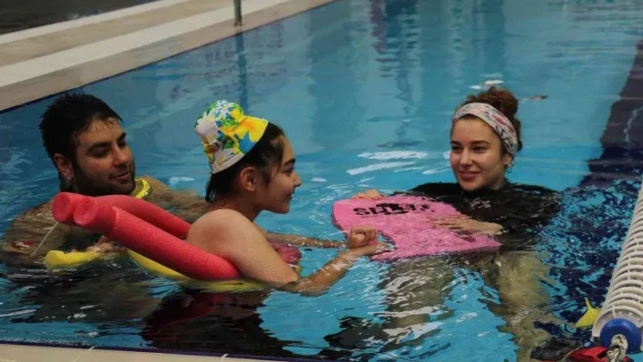 Daha öncesinde yüzme deneyimi olduğunu dile getiren görme engelli Melike Erdoğan, “Havuz içinde ayaklarımı çırpıyorum, az da olsa yüzebiliyorum. Suya ilk defa göremeyerek girdim ve su korkumu yendim” diye konuştu.