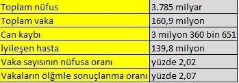 Yeni tip koronavirüs (Covid-19) küresel bir sağlık tehdidi olmaya devam ediyor. Ülkeler virüsle mücadelede toplumsal düzeyde önlemler alarak salgını sonlandırmaya çalışıyor. Hal böyleyken salgının nüfusa etkisi rakamlarla ortaya çıkarıldı. Pandeminin başından beri dünya genelinde vaka sayısı bugün itibarıyla 161 milyon 900 oldu. Güncel verilere göre dünyada 3 milyon 360 bin 651 kişi virüs sebebiyle hayatını kaybetti. Vakaların yüzde 2,07’si ölümle neticelendi.