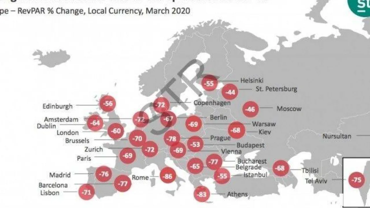 Avrupa ülkeleri arasında mart ayı içerisinde, doluluk oranlarında, en büyük düşüş oranını yüzde 90.8 ile dünyanın en iddialı turizm ülkelerinden İtalya yaşadı. İtalya’nın Mart 2020 doluluk oranı yüzde 6.2 oldu. İtalya’nın Milano kenti de mart 2020’de doluluk oranlarında yüzde 94.5 ile en büyük düşüşü yaşayan destinasyon oldu. Milano’da doluluk oranı yüzde 4 olarak gerçekleşti. Araştırmada yer alan şehirler arasında dünya genelinde en fazla doluluk oranı yüzde 48.5 ile Sydney’de görülürken, sosyal izolasyon konusunda nispeten daha az tedbir aldığı gözlenen ABD’nin Los Angeles kentinde bu oran yüzde 42.5 oldu. Koronavirüs salgının en ağır etkilerinin yaşandığı New York’ta ise bu oran yüzde 34.5 olarak gerçekleşti. Çin’in başkenti Beijing’de ise yüzde 16.4 oldu. Ülke bazında Avrupa’da mart 2020’nin en yüksek doluluk oranı ise yüzde 36.5 ile İngiltere’ye ait.