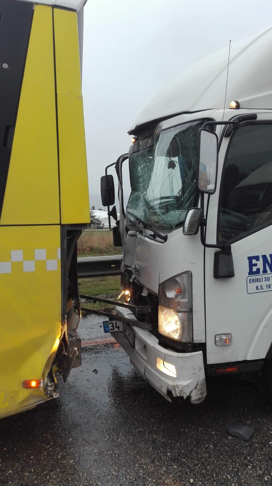 E-5 Otoyolu Kumburgaz mevkiinde aşırı hızlı olduğu iddia edilen kamyon kontrolden çıkarak yolcu otobüsüne çarptı. Kazada yaralanan veya ölen olmazken trafik durma noktasına geldi.