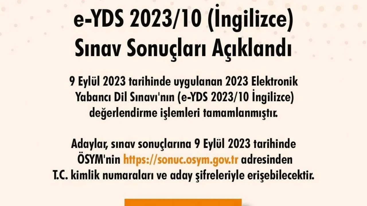 Ölçme, Seçme ve Yerleştirme Merkezi (ÖSYM) Başkanlığı tarafından e-YDS 2023/10 (İngilizce) sınav sonuçları açıklandı.