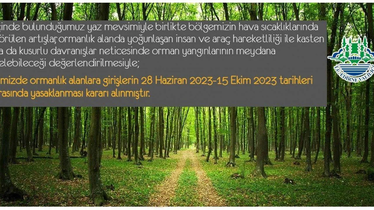 Edirne Valiliği’nden yapılan açıklamada, Türkiye genelinde orman yangınlarının arttığının gözlendiği, son günlerde de orman yangınları açısından oldukça yüksek risk taşıyan olumsuz hava şartlarının oluştuğu belirtildi. Açıklamada, "6831 sayılı Orman Kanunu’nun 74. maddesi ve 5442 sayılı İl İdaresi Kanunu’nun 9. ve 66. maddeleri uyarınca ormanlık alanlara girişlerin 28 Haziran 2023-15 Ekim 2023 tarihleri arasında yasaklanması kararı alınmıştır. Edirne İli sınırları dahilinde bulunan orman parkları ve tabiat parklarında piknik yapmak, spor, yürüyüş vb. faaliyetlerde bulunmak serbesttir. Orman üretiminde çalışanlar, tarım-hayvancılık-arıcılık vb. zirai faaliyetlerde bulunanlar bu yasaktan muaftır. Edirne İli mülki hudutları içerisinde her türlü anız, bağ-bahçe, zeytinlik ve tarla temizliğinden toplanan dalların ve bitki örtüsünün yakılması yasaktır. Ormanlık alanlara yakın yerlerdeki düğün ve benzeri organizasyonlarda orman yangınına neden olabilecek havai fişek, dilek balonu gibi yanıcı madde kullanılmasına izin verilmeyecektir. İlçe Kaymakamlıklarımız ve Orman İşletme Müdürlüklerimiz koordinasyonunda genel kolluk ve orman kolluğundan oluşturulan denetim ekipleri etkin bir şekilde gözetim ve denetim yapacaklardır. Yukarıda belirtilen karar ve önlemlere aykırı hareket edenler hakkında 6831 sayılı Orman Kanunu, Türk Ceza Kanunu ve Kabahatler Kanunu uyarınca idari ve adli işlem yapılacaktır" ifadelerine yer verildi.