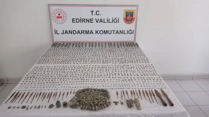 Edirne’nin Uzunköprü İlçesi Mescid Mahallesinde İl Jandarma Kaçakçılık ve Organize Suçlarla Mücadele (KOM) ekiplerince Kültür ve Tabiat Varlığı Kaçakçılığı ile Mücadele faaliyetleri çerçevesinde bir şahsın evinde yapılan arama sonucu Bizans ve Roma dönemlerine ait olduğu değerlendirilen 3 bin 130 adet bronz sikke, 2 adet mızrak ucu, 39 adet ok ucu, 3 adet yüzük, 1 adet mühür, 2 adet minyatür heykel, 4 adet obje, 1 adet broş ve 1 adet kolye ve olmak üzere toplam 3 bin 183 adet tarihi eser ile 30 adet tabanca fişeği ele geçirildi.
