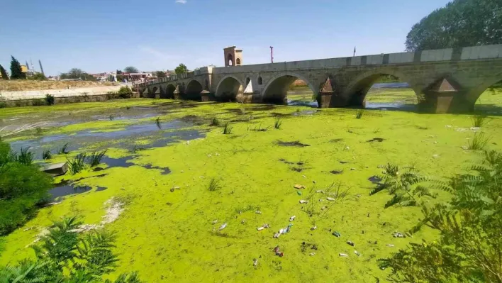Edirne'de hava sıcaklıklarının artmasına bağlı olarak kuruma noktasına gelen Tunca Nehri kirlilikten yeşil renge döndü.