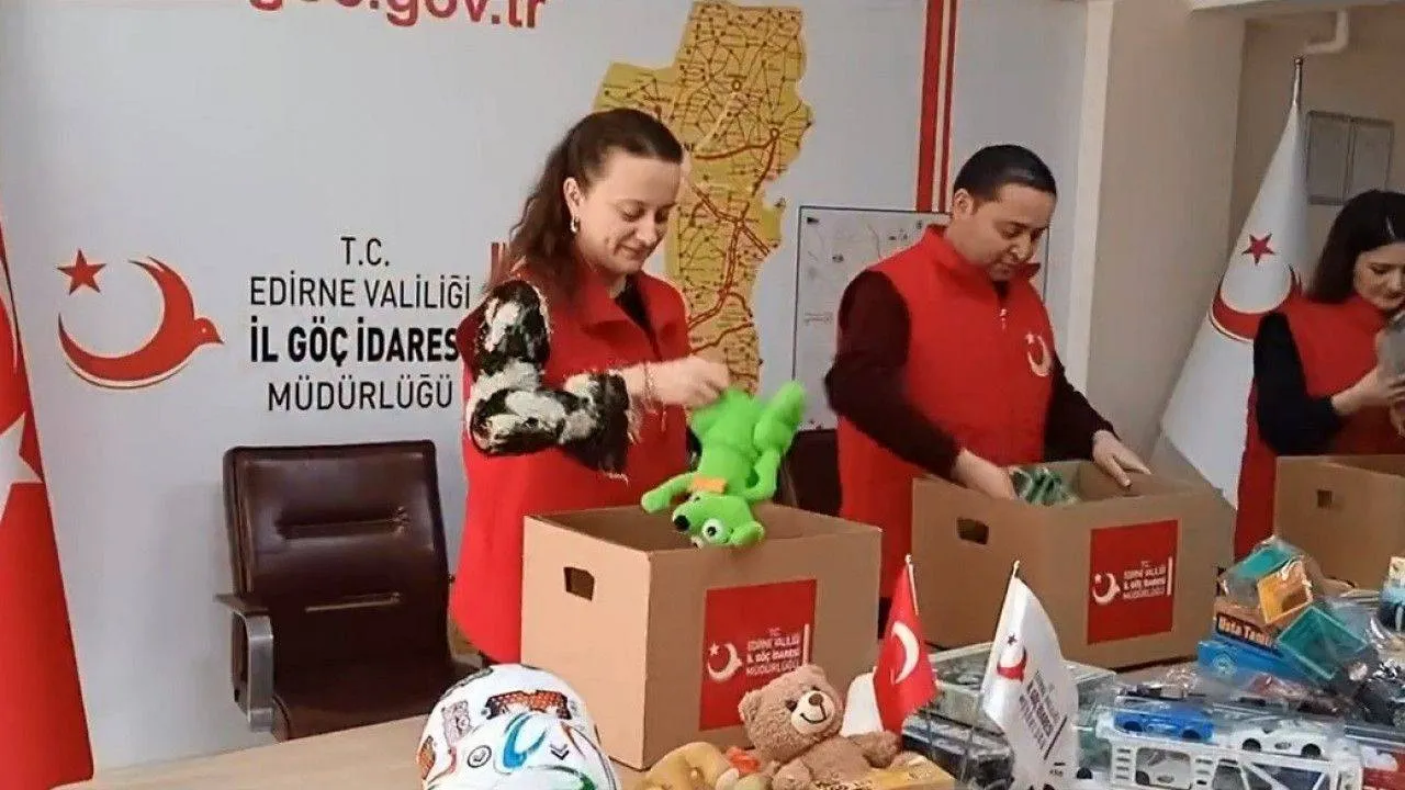 Göç İdaresi Başkanlığı’nca başlatılan "Oyuncak Kardeşliği" seferberliği çerçevesinde Edirne İl Göç İdaresi Müdürlüğü tarafından toplanan oyuncaklar, Hatay’daki depremzede çocuklara ulaştırıldı.